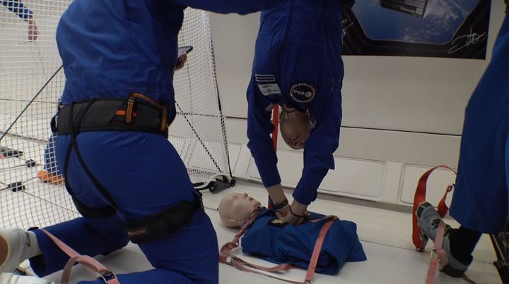 Sophie Adenot s'entraîne à effectuer un massage cardiaque sur un mannequin lors d'un vol parabolique,en Gironde,le 18 avril 2024. (EUROPEAN SPACE AGENCY)
